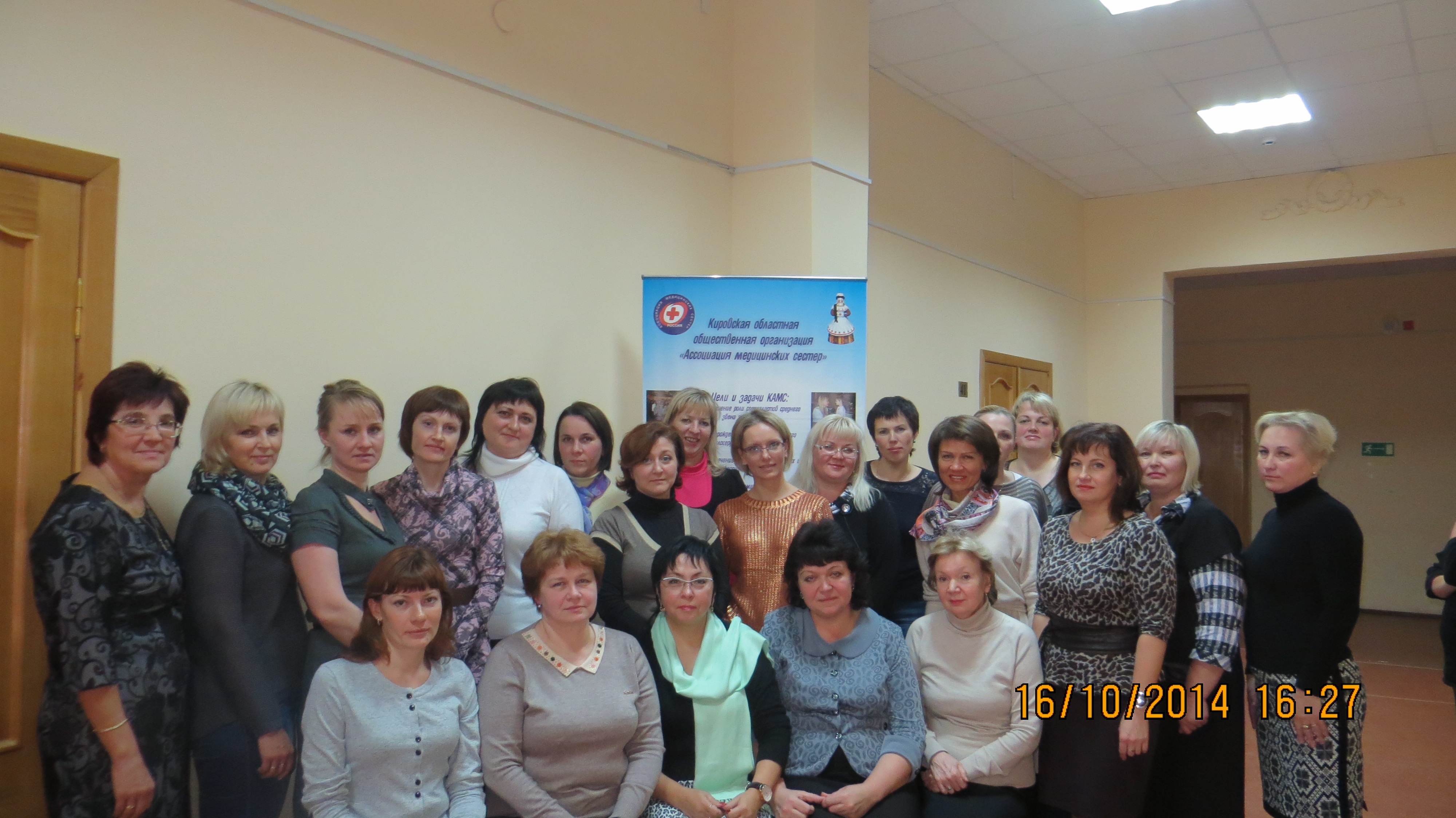 16 октября 2014 года на базе КОГБОУ СПО «Кировской медицинский колледж» состоялся очередная встреча старших и главных медицинских сестер медицинских организаций и преподавателей колледжа – членов Ассоциации медицинских сестер Кировской области. В ходе семинара были рассмотрены темы: «Деятельность Кировской ассоциации медицинских сестер», «Организация деятельности ключевых членов КАМС», «Рекрутинг в контексте КАМС», «Совершенствование работы ключевых членов КАМС в медицинских учреждениях с применением современных технологий и коммуникаций».