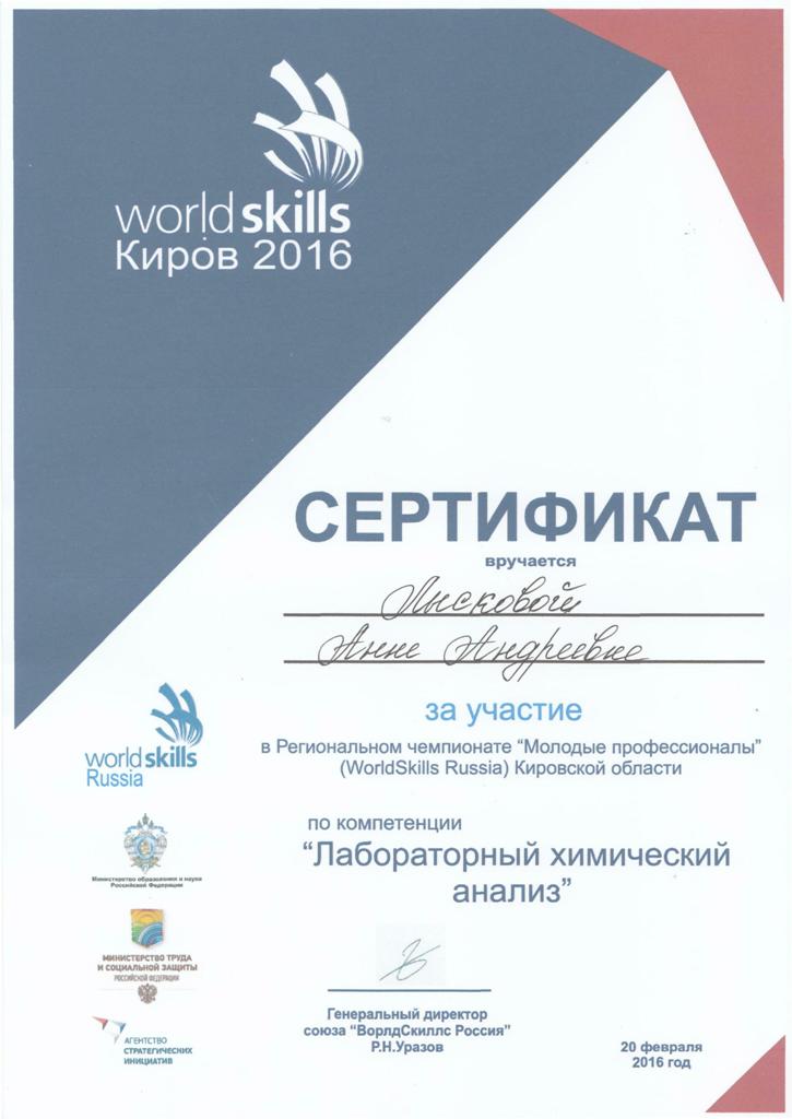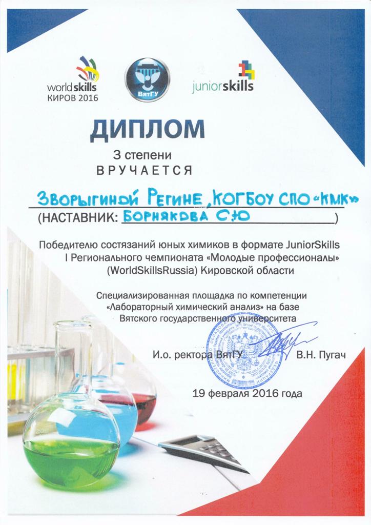 Героиней чемпионата «Молодые профессионалы» WorldSkills Кировская область по компетенции «Лабораторный химический анализ» стала студентка группы 320 специальности «Лабораторная диагностика» Лыскова Анна Андреевна. В течение двух дней напряженной практической деятельности по выполнению конкурсного задания, Анне потребовались и профессиональные знания и умения, полученные во время практики при изучении дисциплин «Химия» и «Физико-химические методы исследования и техника лабораторных работ», и мужество, решительность и уверенность для демонстрации умений в условиях конкуренции со студентами других колледжей и ВУЗов, обучающихся по профилю чемпионата. Подготовка велась в сжатые сроки, специфика деятельности лабораторного техника, конечно, отличается от заявленной компетенции, но Диплом участника конкурса такого высокого уровня – очень весомая оценка. Руководители подготовки Борнякова Светлана Юрьевна и Лазарева Марина Николаевна. Преподаватель химии Борнякова Светлана Юрьевна была приглашена и приняла самое активное участие в работе чемпионата, выступив в качестве эксперта.