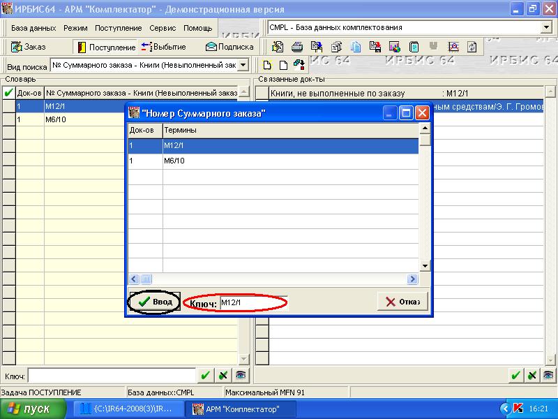 В ключе задаем Номер Суммарного заказа. Курсор останавливается на найденном номере . Далее делаем Ввод