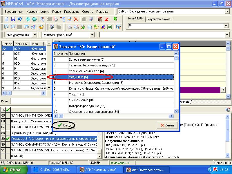 Выбираем из предлагаемого списка раздел, к которому относится обрабатываемая книга и делаем Ввод