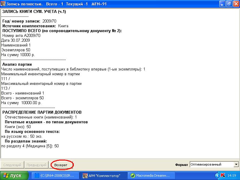 Это данные, которые получились в результате пополнения записи КСУ, они сравниваются с данными введенными с сопроводительного документа, идентифицируя возможные ошибки, допущенные при обработке документов поступившей партии. Далее нажимаем клавишу Возврат