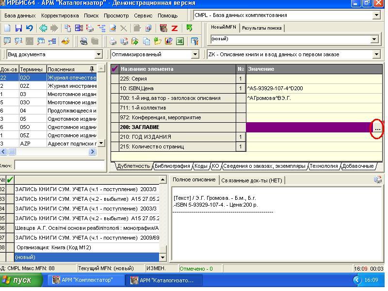Переходим к заполнению 200 поле (Заглавие). Открываем