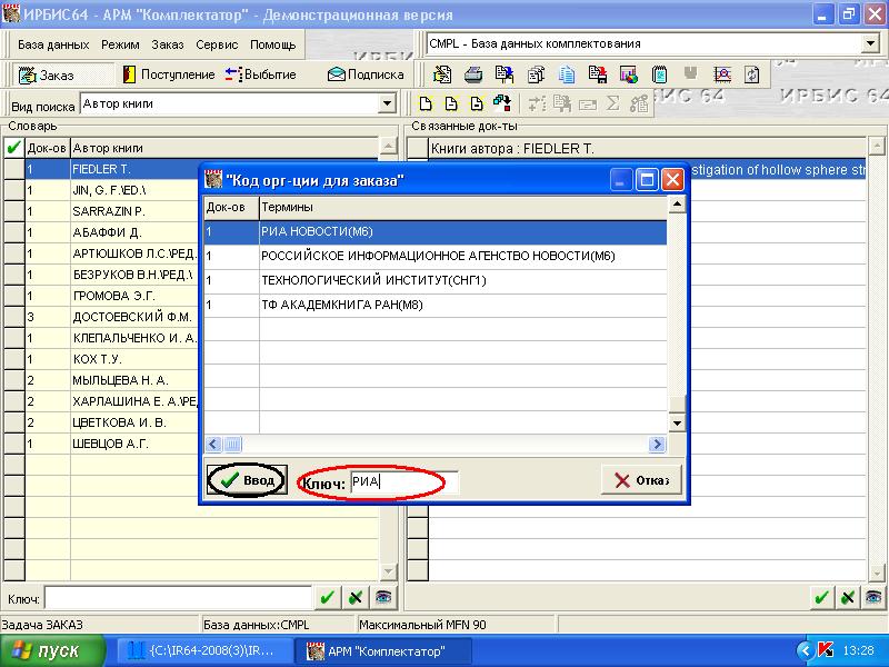 В ключе Задаем первые буквы организации, в которой хотим заказать книги, курсор устанавливается на найденной организации и делаем Ввод