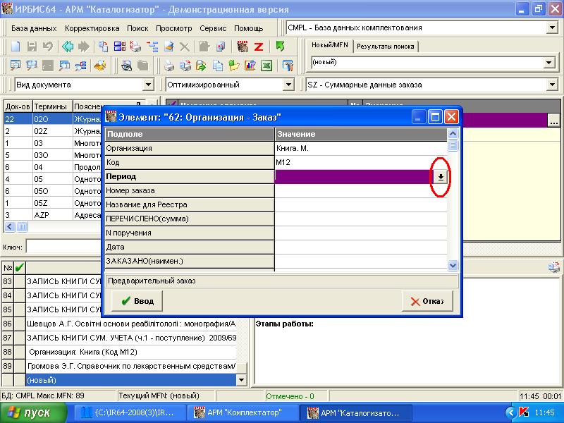 В результате у нас из словаря перенеслись 2 элемента - Наименование организации и Код этой организации (обязательный элемент). Открываем меню-справочник Период