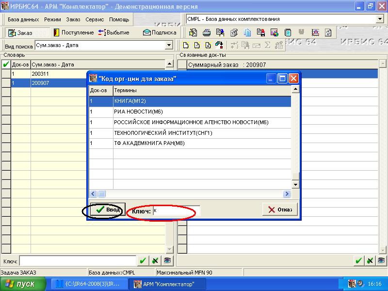 Открывается словарь организаций БД CMPL. В ключе задаем начальные буквы наименования организации, курсор устанавливается на найденной организации, поэтому делаем Ввод