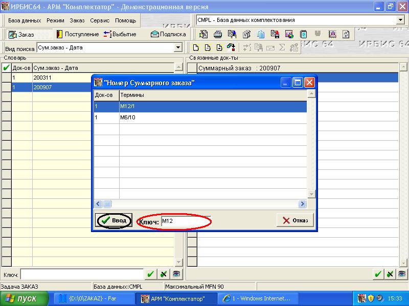 Открывается словарь Номеров суммарного заказа. В ключе задаем код организации и курсор останавливается на том номере, который соответствует введенной организации. Делаем Ввод