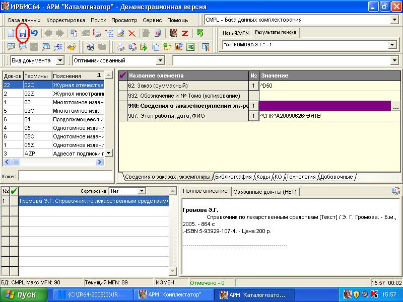 Далее можно заполнить 910 поле (сведения о заказе/поступлении экземпляров) сейчас, если известно в какие подразделения пойдут эти 50 экземпляров, если же это неизвестно, то это поле надо заполнить на этапе регистрации. Допустим, что неизвестно, в какие подразделения пойдут эти экземпляры, значит 910 поле не заполняется. Можно перейти на страничку Коды и заполнить поле Автор заказа, источник информации (оно идет в словарь). Если же это поле не заполняется, то делаем Сохранить
