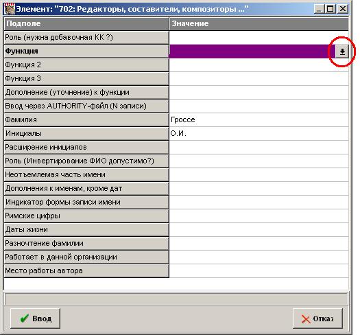 Вводим Фамилию и инициалы лица (художника). Для ввода кода его "Функции" открываем справочник-меню