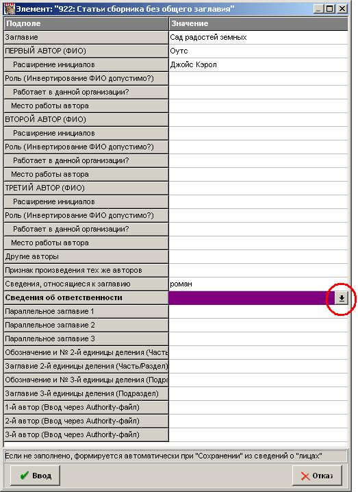 Вводим Заглавие и Автора третьего произведения. С использованием справочника-меню вводим Сведения, относящиеся к заглавию (роман). Для ввода сведений о переводчиках второго произведения открываем словарь авторов