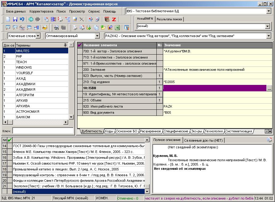 Год издания в РЛ представлен в поле 210 с разделителем подполя, который проставлен автоматически. В окне просмотра формируется библиографическое описание.