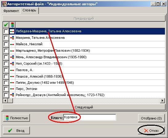 С использованием окна «Ключ:» пытаемся найти ФИО, но такая фамилия отсутствует, (курсор устанавливается на ближайшую к заданной), для выхода - «Отказ»