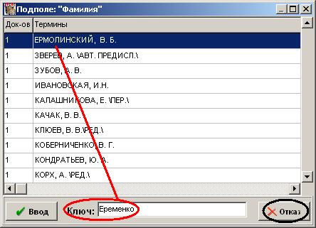 С использованием окна «Ключ:» пытаемся найти ФИО, но такая фамилия отсутствует, (курсор устанавливается на ближайшую к заданной), для выхода - «Отказ»
