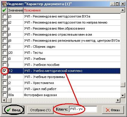С использованием окна "Ключ:" находим нужное значение (Учебно-методический комплекс) и отмечаем его "галочкой". Для возврата в РЛ подполей - «Ввод»