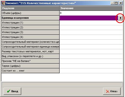 Вводим объем (8). Для ввода Единицы измерения объема открываем иерархический справочник-меню