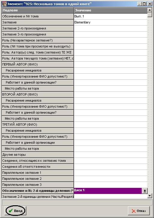 Вводим номер выпуска (1), Заглавие, Обозначение и номер 2-ой единицы деления (Диск 1). Для возврата в РЛ - «Ввод»