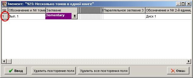 В табличном виде каждое повторение поля представляется в виде строки, а отдельные подполя расположены в столбцах. В первой строке видим введенные данные о первом диске (обозначение и номер первого выпуска, а также обозначение и номер первой его части), причем на рисунке незаполненные столбцы для наглядности сжаты по ширине. Чтобы открыть следующую строку для ввода данных о втором диске (вторая часть первого выпуска), щелкаем по "1" в первом столбце