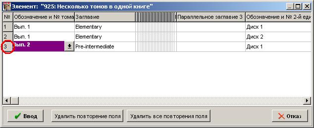 Открывается 3-я строка. Вводим в нее данные о первой части второго выпуска, используем при этом возможность копирования данных (двойной щелчок в пустом столбце, куда нужно пскопировать данные из предыдущей строки того же столбца). Чтобы открыть следующую строку для ввода данных о следующем диске (вторая часть второго выпуска), щелкаем по "3" в первом столбце (номер строки, за которой хотим вставить новую)