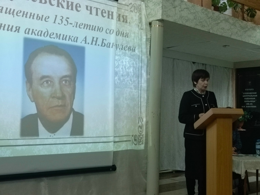 С докладом "Медицина в контесте музейной экспозиции на примере музея истории Кировского медицинского колледжа им. Л. А. Фоминых" в Бакулевских чтениях выступила руководитель музея истории Кировского медицинского колледжа им. Л.А. Фоминых Екатерина Владимировна Емшанова. Также звучали доклады доктора медицинских наук, профессора, заведующего краеведческим сектором научной медицинской библиотеки при МИАЦ, ЦОЗМП Куковякина С. А., архивариуса Слободской ЦРБ Трапезникова Н. П., семьи Кожевниковых.