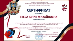 Студенты 1 курса специальности «Фармация» Юлия Туева и Анна Караваева, под руководством преподавателя истории - Надежды Владимировны Копысовой успешно выступили на Всероссийской междисциплинарной Олимпиаде для студентов медицинских образовательных организаций среднего профессионального образования, посвящённой 95-летию ГБПОУ «Донецкий медицинский колледж».